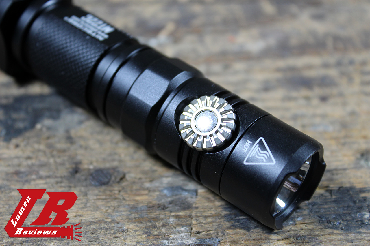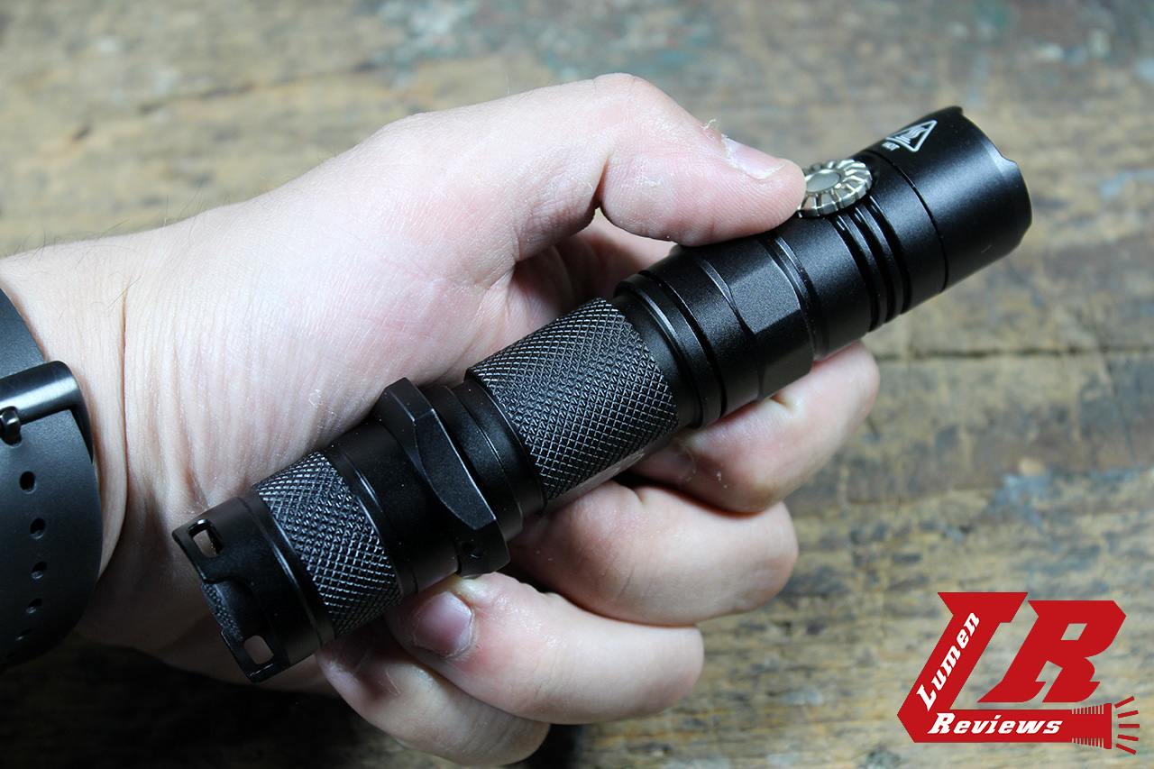 The MT22C is a tactical 1×18650 light with a mechanical switch at the tailcap and a rotating bezel at the head to change the brightness of the XP-L HD Emitter in the head.