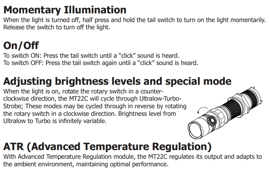 The In the past I had different Nitecore lights with infinite output variation via bezel. While the other Nitecore lights had the bezel run along the head, the bezel on the MT22C is smaller and more knurled, and is positioned in a precise spot at the head. Another difference is that while the other bezels increased brightness rotating in a clockwise way, the bezel of the MT22C works in a counterclockwise way.