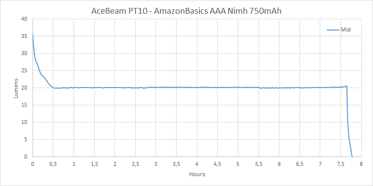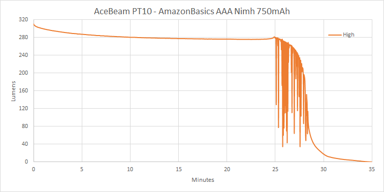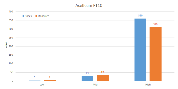 Ancora, aumentare l’output massimo mantenendo gli altri livelli bassi crea un buco nella numinosità . Con la PT10 posso scegliere se avere 30 lumen (per mezz’ora, poi 20 per 7 ore), e se non sono sufficienti per il mio buio, BAM! 310 lumen, ma poi dopo mezz’ora la torcia è praticamente scarica.