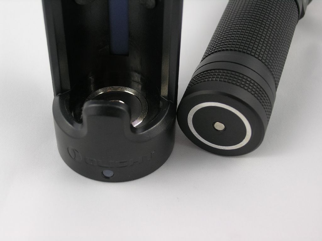 Il portatorcia si usa per caricare la torcia. ha un sistema magnetico sul fondo che richiama quello degli altri caricabatterie magnetici di olight.