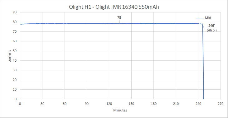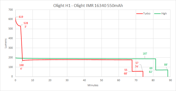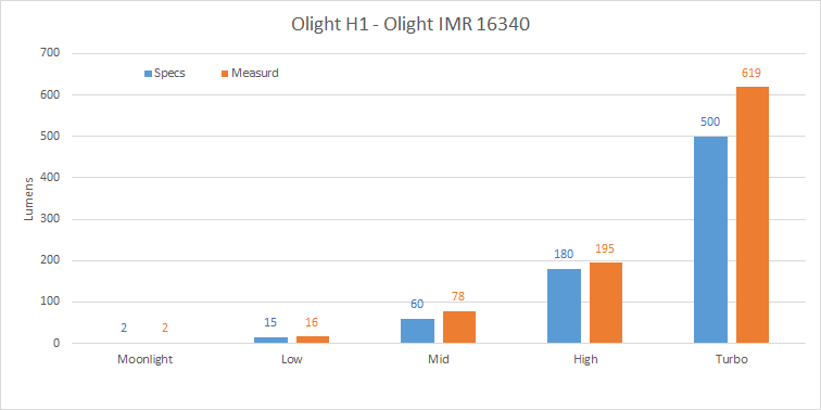 A parte il livello Turbo, gli altri sono gli stessi della H1. I test della H1 li ho fatti con una batteria da 550mAh, mentre la H1R viene fornita con una batteria da 650mAh. Quindi il runtime dovrebbe essere più lungo circa del 18%.